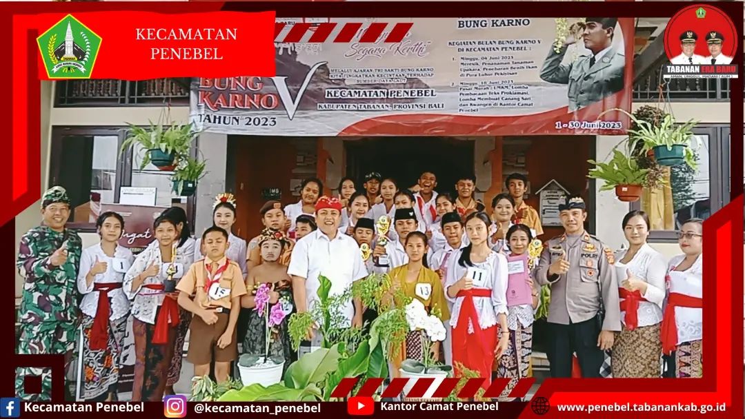 Perayaan peringatan bulan Bung Karno ke-V tahun 2023 di Kecamatan Penebel, yang diisi dengan kegiatan lomba membaca Teks Proklamasi dan lomba membuat perlengkapan Upacara Agama serta pelaksanaan Pasar Murah oleh UMKM lokal Penebel. Minggu, 18 Juni 2023.